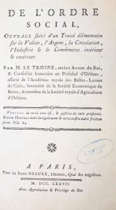 LE TROSNE (Guillaume-François). De l'Ordre social, Ouvrage suivi d'un Traité élémentaire sur la Valeur, l'Argent, la Circulation, l'Industrie & le Commerce intérieur et extérieur. Paris, Frères Debure, 1777. 2 parties en un volume in-8, veau...