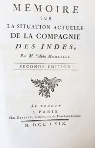 MORELLET (l'abbé André). Mémoire sur la situation actuelle de la Compagnie des Indes. Seconde édition. Se trouve à Paris, Desaint, 1769. - [NECKER (Jacques)]. Réponse au Mémoire de M. l'abbé Morellet sur la Compagnie des Indes… Paris, De...