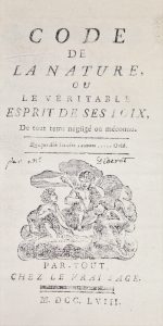 [MORELLY (Étienne-Gabriel)]. Code de la nature, ou le véritable esprit de ses loix, de tout tems négligé ou méconnu. Par-Tout, Chez le Vrai sage, 1758. In-12, cartonnage papier marbré (Reliure moderne). Seconde édition, rare. L'ouvrage occupe...