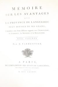 PARMENTIER (Antoine-Augustin). Mémoire sur les avantages que la province de Languedoc peut retirer de ses grains, considérés sous leurs différens rapports avec l'Agriculture, le Commerce, la Meunerie et la Boulangerie. Paris, De l'Imprimerie des...