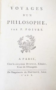 POIVRE (Pierre). Voyages d'un philosophe. Paris, Chez la citoyenne Dupuis, De l'Imprimerie de Hautbout, l'An V [1797]. In-8, basane racinée, roulette dorée, dos lisse orné, pièce de titre rouge (Reliure de l'époque). Sabin, n°63719. Édition en...