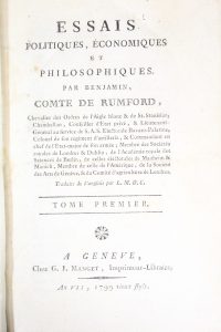 RUMFORD (Benjamin Thomson, comte de). Essais politiques, économiques et philosophiques. Genève, Manget, An VII, 1799. 2 volumes in-8, demi-veau vert, dos orné, tranches marbrées (Reliure vers 1840). Coquelin et Guillaumin, t. II, p. 562. -...