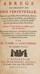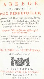 SAINT-PIERRE (Charles-Irénée Castel de). Abrégé du Projet de paix perpétuelle. Rotterdam, Jean-Daniel Beman, Et se vend à Paris chez Briasson, 1729. In-12, veau moucheté, dos orné, tranches mouchetées de rouge (Reliure de l'époque)....