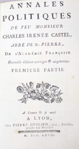 SAINT-PIERRE (Charles-Irénée Castel de). Annales politiques. Nouvelle édition corrigée & augmentée. Genève & se vend à Lyon, Pierre Duplain, 1767. 2 volumes in-12, veau marbré, dos orné, pièces de titre rouge et de tomaison fauve, tranches...