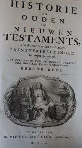 BIBLE DE MORTIER. Histoire du Vieux et du Nouveau Testament. Anvers, Pierre Mortier, 1700. 2 volumes in-folio, demi-basane de l'époque. Remarquable édition, illustrée de 2 frontispices, d'une vignette répétée sur les titres, de 3 vignettes en...