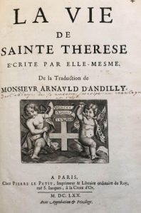 Vie de Sainte Thérèse d'Avila, traduite par Arnauld d'Andilly. L'ouvrage comporte une prière manuscrite à la Vierge sur la première garde, ainsi qu'une autre mention manuscrite du la page de titre, mentionnant l'appartenance de l'ouvrage à l'abbaye de St Antoine (futur hôpital Saint-Antoine).