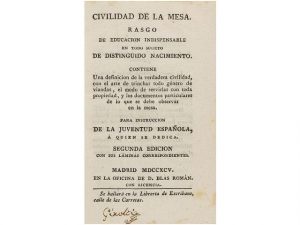 viandas, el modo de servirlas con toda propiedad, y los documentos particulares de lo que se debe obervar en la mesa. Para instrucción de la juventud espanola. Segunda edición con sus laminas correspondientes. Madrid: en la oficina de Blas Roman, 1795. 12°. 46 p. Cubiertas modernas de papel de guardas. 2 laminas grabadas calcograficamente que contienen cuatro escenas del corte de carnes. Muy raro. Pequeno librito dedicado a los jóvenes y a como se han de comportarse en la mesa. Siguen las diversas maneras de trocear las carnes. 'Cap. IV. Arte de Trinchar. Modo de partir el cordero. Disección del javali y del puerco. Disección del javali y del puerco de leche. Modo de trinchar el anade, la zarceta, ó qualquier otro paxaro aquatil. Disección de la liebre. Modo de servir los pescados. De la pasteleria. Frutas.