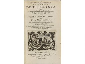 Accubitus in coena Antiquorum origine Dissertatio. Amstelodami: Sebastiani Combi & Joannis Lanou, 1664. 8° menor. 10 p. + 445 p., 12 h. Grabados en el texto y en la portada. 15 laminas de las que 5 son plegadas. Enc. en pergamino de época rotulado en el lomo. Ex-libris de antiguo poseedor. Buen estado de conservación.