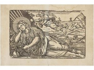 [1672.]. (BARCELONA). [ABADAL, PERE:]. SANTA MAGDALENA PENITENTE, AL FONDO UNA RARA VISION DE BARCELONA. Xilografia, 19x29 cm. Papel tostado, restos de humedad. Posiblemente sea este un tiraje posterior. En el fondo de la imagen se ve un montana con...