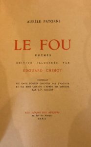 Le fou. Aux dépens des auteurs Paris 1921. Première édition illustrée par Edouard CHIMOT. L'un des 15 ex. de tête réimposé au format in-4. Bien complet d'un dessin original pleine page en couleur signé de Chimot et de 3 états des eaux-fortes, un en couleur et deux en noir et blanc. Très belle reliure in-4 plein maroquin noir, contre plats à encadrement de maroquin noir et filets or, dos à 5 nerfs, trois tranches dorées, couvertures conservées (reliure signée Noulhac). Petites rousseurs pâles sur les trois premières pages sinon très bel exemplaire.