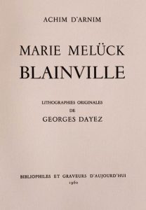 Marie Melück Blainville. Bibliophiles et graveurs d'aujourd'hui Paris 1960. Traduction de l'allemand par Th. Gautier. Première édition illustrée par Dayez. Tirage limité à 120 ex. sur vélin d'Arches, seul grand papier, celui-ci n°80 nominatif. En feuilles in-4 sous chemise et étui, dos jauni.