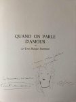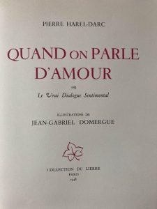 Quand on parle d'amour ou le vrai dialogue sentimental. Collection du lierre Paris 1948. Première édition illustrée par Domergue, tirage limité à 350 ex., celui-ci l'un des 280 ex. sur Pur fil du maraais, 2ème papier arpès 70 vélin de Rives. Envoi autographe signé de l'auteur et de l'illustrateur avec un petit dessin au stylo en page de titre. En feuilles in-4 sous chemise et emboîtage.