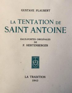 La tentation de Saint Antoine. La tradition 1943. Première édition illustrée par les eaux-fortes de Hertenberger. Tirage limité à 300 ex. sur vélin d'Arches, seul grand papier, celui-ci l'un des 100 «auquel a été ajouté un état des eaux-fortes, sur Arches» : manque la suite annoncée mais l'exemplaire truffé d'une suite avec remarque sur Japon, et d'un dessin original en frontispice, avec un envoi autographe signé de l'illustrateur. En feuilles in-4 sous chemise tachée, chemise étui plein cartonnage éditeur, dos taché, étui avec une trace de scotch sur une charnière en pied et en tête.