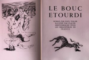 Le bouc étourdi. Les bibliophiles de France Paris 1951. Première édition illustrée par Hertenberger. Tirage limité à 315 ex. sur vélin de Rives, seul grand papier, celui-ci n°33 nominatif. Celui-ci complet de l'une des 27 suites des eaux-fortes en deux états, un sur Chine, un sur Malacca, dans un étui séparé (erreur au colophon qui annonce Lalau). Ex. enrichi de deux dessins originaux au crayon, un avec envoi autographe signé en frontispice, signé en coin inférieur droit et daté de 1953, un signé en bas à droite, deux eaux-fortes numérotées et signées, un des cuivres ayant servi à l'illustration de ce livre, un menu du restaurant Drouant du 8 décembre 1951 avec envoi autographe signé de Vialar. En feuilles in-4 sous chemise et étui, charnière fendue sur la chemise des suites.