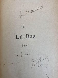 Là-bas. Stock Paris 1899. Mention de 19ème édition. Envoi autographe signé au Dr Dumesnil en page de faux titre et truffé d'un article de presse sur le satanisme dans l'église avec avis de Huysmans, monté sur onglets. Plein veau in-12, plat à triple encadrement or, contre plats à la roulette, dos à 5 nerfs orné de dorures, insolé, pièce de titre sur cuir marron, tête dorée, couvertures conservées.