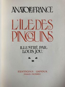 L'île des pingouins. Ed. Lapina Paris 1926. Première édition illustrée par Louis JOU, tirage limité à 500 ex., l'un des 410 ex. sur Hollande. Deux tomes en deux volumes in-4 demi maroquin à coins rouge, dos à 4 nerfs, têtes dorées, reliures et dos conservés, intérieur frais.