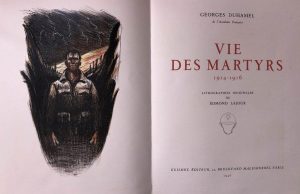 Vie des martyrs, 1914-1916. Guilhot éditeur Paris 1946. Première édition illustrée par Lajoux, tirage limité à 890 ex., celui-ci l'un des 830 ex. sur vélin de Rives, cinquième papier. En feuilles in-4 sous chemise et étui illustré, étui piqué.