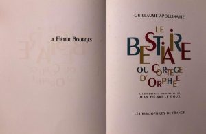 Le bestiaire ou cortège d'Orphée. Bibliophiles de France Paris 1962. Première édition illustrée par Picart Le Doux. Tirage limité à 140 ex. sur Rives, celui-ci n°33 nominatif. Complet de l'une des 25 suites sur papier multicolore. En feuilles in-4 sous chemise et étui.