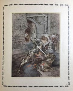 La légende du Roi Arthur et des chevaliers de la Table Ronde. Ed. Piazza Paris 1920. Première édition illustrée par Rackam. L'un des ex. sur Japon Impérial, seul grand papier. Reliure in-4 demi maroquin orangé à coins, dos lisse richement décoré et mosaïqué d'une guirlande de fleurs, tête dorée, couvertures conservées.