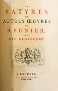 REGNIER Mathurin : Les satyres et autres oeuvres. Chez Lyon et Woodman Londres 1729. E.O. sur beau et fort papier. …