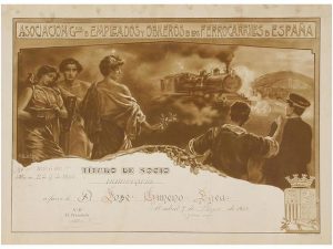 1933. LARA, J.C. DE: TITULO DE SOCIO DE LA ASOCIACION Gral. DE EMPLEADOS Y OBREROS DE LOS FERROCARRILES DE ESPANA. Madrid: Imp. Rivadeneyra, 1933. Bella litografia color sépia. 50x71 cm.