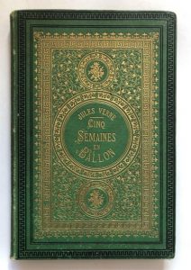 Cinq semaines en ballon par Jules Verne. Illustrations de Riou et Montaut. Paris, Bibliothèque d'Éducation et de Récréation, J. Hetzel Éditeur, sd (ca 1873). Grand in-8 simple, cartonnage en pleine vert gazon et «aux bouquets de roses» du 4e type. Charles Magnier relieur. Imprimerie Gauthier-Villars. Feuillets de la table des matières légèrement débrochés. Tranches dorées. Gardes bleu-gris. Bel exemplaire dans une couleur peu fréquente pour ce cartonnage qui ne fut utilisé que pour des rééditions.