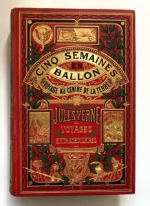 Cinq semaines en ballon/ Voyage au centre de la Terre. Illustrations de Riou et Montaut puis Riou seul. Paris, Collection Hetzel, sd (ca 1907). Grand in-8° double, cartonnage éditeur polychrome «à un éléphant titre dans l'éventail». Engel Relieur. Tranches dorées. Gardes bleu. Huit planches hors-texte en couleurs. Imprimerie Gauthier-Villars. Le numéro d'impression 35091 place le tirage en 1904. Trois minuscules éclats de bleu sur le dos. Sinon très bel exemplaire.