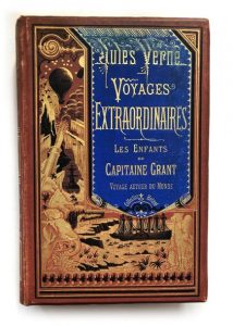Les Enfants du capitaine Grant. Illustrations de Riou. Paris, Bibliothèque d'Éducation et de Récréation, J. Hetzel Éditeur, sans date. Grand in-8° triple. Cartonnage bicolore “à la bannière” de type 3, à la bannière bleu sur fond havane, “Collection J. Hetzel” en bas de la bannière. Catalogue EL enfin de volume. Légère décoloration de la partie supérieure de la bannière. Plaque et couleurs éclatantes.