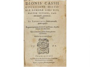 1592. (HISTORIA). CASII COCCEIANI , DIONIS [CASSIUS]: HISTORIAE ROMANAE LIBRI XLVI. Partim integri, partim mutili, partim excerpti : Ioannis Leunclavii studio tam aucti quam expoliti. Fragmenta priorum XXXIV amissorum, & posteriorum XX librorum....