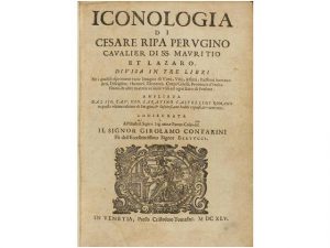 1645. CONTARINI, GIROLAMO: ICONOLOGIA DI CESARE RIPA PERUGINO CAVALIER DI SS. MAUTITIO ET LAZARO DIVIDA IN TRE LIBRI. Venetia: presso Cristoforo Tomasini, 1645. 4° menor. 33 h. + 685 p. Texto a dos columnas con xilografías en texto. Papel tostado....