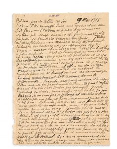 Lettre du front adressée à Louise de Coligny. «Ptit Lou pas de lettre de toi hier - T'envoie aujourd'hui dans un autre pli deux amusants fragments de papier de tenture second empire. Je les ai décollés dans une maison complètement réduite en ruines [...] c'est de l'imagerie amusante et rare [...] il y a des collectionneurs qui s'y intéressent. [...] Raconte moi [...] ce que tu as fait quand t'as été voir Toutou [autre amant de Lou] [...] tu sais bien que je ne suis pas si jaloux et voudrais bien participer un peu de loin, aux amusements du p'tit Lou [...] ai un grand désir de photos du p'tit Lou très chéri [...]».