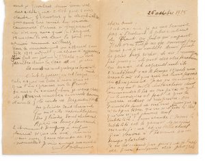 APOLLINAIRE Guillaume (1880-1918) — Lettre autographe signée adressée à une amie depuis le front – S.l., 26 octobre 1915. – 4 pages in-12 à l'encre (tête effrangée).