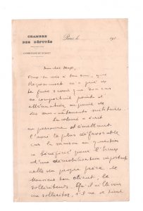 Signed autograph letter addressed to Max JACOB. Paris, circa 1917. 2 pages in-8 on the letterhead of the Chamber of Deputies. Unpublished letter, about the deputy Charles REGISMANSET, then director of the Ministry of Colonies. It dates from the time when Apollinaire was collaborating at Excelsior. Apollinaire specifies to the poet and friend Max Jacob: "Do you want to tell your friend that Regismanset asked me to let you know that his case does not include any reduction in the point of view of utilitarian underwear. Nevertheless, I will see him with pleasure and regret that he climbed up to my pigeon loft without finding me there [...] Come and see me anyway, would Father Janvier say, who must at least speak as well as Victor Hugo's father [...]".