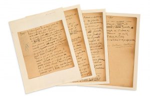 Smoke. La vie anecdotique, autograph manuscript signed March 1918. 4 in-8 pages in ink on paper, each one glued on an in-4 sheet. (Slight ink stain not affecting the text). Manuscript dedicated to tobacco, titled, signed and including corrections and erasures by Guillaume Apollinaire. Text published in the March 16, 1918 issue of the Mercure de France. "...] In a town in Italy, a few years before the war, one of those rich and sadistic Germans who translated their crude and complicated imaginations into splendidly banal settings asked me to go and see his books, his collection of fetishes from Oceania and Africa and his paintings by Gauguin. This man, whose name was of little importance, was trying to compete in refinement with what he had heard of some English people and in taste with what he knew of the French. Among his paintings there were a few fakes, and his fetishes had been chosen indiscriminately, and as for his books, I had no time to look at them. I was taken to a smoking room where the German upstart was sitting in a leather armchair smoking Egyptian cigarettes, while next to him, naked, an ideally thin girl was waiting for him to take three or four puffs before throwing her away, he put out his cigarette on the kidneys of the little girl whose skin was quivering and a burn stained the whiteness of the charming body which the cynical German tortured with an indifferent air. Imagine a character with a military rank and imagine the excesses to which his inveterate smoking mania could lead him ...". This provocative text by Apollinaire is not without reminding us that a few years earlier he had prefaced and edited at the Bibliothèque des Curieux, a work devoted to the Marquis de Sade.