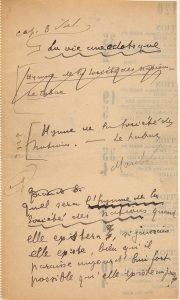 La Vie Anecdotique, autograph manuscript signed [Circa 15 August 1918]. 12 leaves mounted in a large volume in-8 in brown ink on paper. Soft binding signed LOUTREL, full ebony chagrin with gilt title on the first cover, smooth spine, amaranth deerskin lining and endpapers, black half-banded half chagrin folder, slipcase. Complete manuscript of one of the last chronicles of La Vie anecdotique, this one published on August 16, 1918. La Vie anecdotique, a column of the Revue de la quinzaine du Mercure de France, was created for and hosted by Apollinaire from April 1911, who ran it until his death. Apollinaire "invented a formula: the anecdote [...] on a thousand strange, touching subjects, seized at random by chance from unexpected encounters, chatter, walks, the anecdote reveals its immense poetic charge" (Pléiade. Complete prose works, III, 1163). "[...] What will be the hymn of the League of Nations when it exists, if it ever does exist, although it seems today quite possible that it will exist one day. It seems that it already has its flag. It could also take Béranger's song "La Sainte Alliance des Peuples" as its anthem: "I saw peace descend on the earth taking gold, flowers and ears of corn, the air was coloured and from the god of war it choked the sleeping wraths [...]". REFERENCES Revue de la quinzaine (Mercure de France) t. CXXVIII, no. 484, August 16, 1918, pp. 754-758; Apollinaire, Pléiade. OEuvres en prose complètes, III, 289-293.