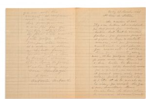 Signed autograph letter addressed to René de SOLIER Rodez, November 28, 1945. 4 pages in-4 in pencil on school paper (horizontal and vertical folds). A hallucinated letter, testifying to ARTAUD's obsessions. He wants to put an end to a spell: "There is an absurd story that must come to an end. It is a story that everyone is talking about, that until a short time ago nobody wanted to confess, but that nobody now can no longer fail to recognize". He had a vision: "[...] I have seen your consciousness from afar many times, especially in a red and black hell and I don't know what you've been told, but I've helped this red and black soul to live with my breath..." He reread his poems: "...More than one heartless poet has taken your soul from the Burmese monks or the Himalayan lamas. This is what gives that compression of asphyxiation of the soul that one feels in all your sentences as a poet resigned to describe impressions because a panic has taken his bombs and this panic comes from the Christian masses of Europe and the lama rites of Tibet, not to mention the prayers to God in the belly of the streets of Paris and the slopes of Turkestan... Do something to make it stop and help me go to Tibet to make all the soul drinkers and poetry thieves give their throats back...". René de Solier, historian and art critic, was close to Antonin Artaud.