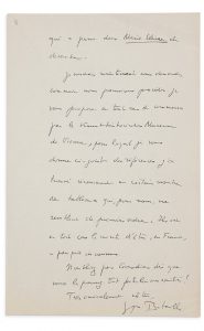 Signed autograph letter addressed to Joseph-Marie LO DUCA Orléans, September 15, 1959. 2 pages in-8 in ink on paper. Lo Duca directed some collections specializing in eroticism and collaborated closely with the work of Georges Bataille. "[...] Since I saw you, I have found, in Paris, two very beautiful drawings by Picasso. I asked Kahnweiler to have two of them made. I think you agree. On the other hand, I saw Pierre Klossowski. I would like to reproduce three of these drawings, plus one of the illustrations for "Roberte ce soir [...] I think the image of Jeanne Moreau dressed as a blue angel that appeared in Marie Claire in December is very beautiful [...] [...] I recently found a number of paintings that, for us, seem first-rate. In any case, they have the merit of being, in France, almost unknown. Don't forget Girodias as soon as you can and give him my regards".