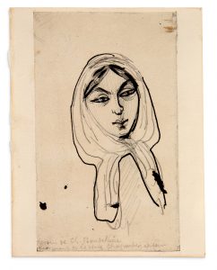 Portrait of Jeanne DUVAL, original drawing Pencil, ink and pencil, 13,5 x 8 cm, pasted on strong paper. Precious portrait of her "cursed" mistress. One of the four drawings Baudelaire left of Jeanne Duval, none of which is captioned with her name, executed at several moments of her life: "The only woman I ever loved" (letter to Narcisse Ancelle, June 30, 1845). Jeanne Duval occupies a central place in Baudelaire's life and work. He met her in the spring of 1842, and lived intermittently with her for nearly twenty years a tempestuous passion that evolved into a charitable love when the beautiful woman, aging and moving away from him, became a "wreck". Les Fleurs du mal devote several major poems to her, sometimes referred to as the "cycle de Jeanne". Thus, in I give you these verses: "[...] Cursed be you who from the deepest abyss, To the highest heaven nothing, except me, answers; - O you who, like a shadow with an ephemeral trace, Crowds with a light foot and a serene look The stupid mortals who judged you bitter, Statue in the eyes of jet, great angel with a bronze forehead!". Baudelaire's mother destroyed all their letters after the death of her son. The real name of this woman of colour remains uncertain, Duval, Lemer, Lemaire or Prosper according to the documents, as well as her origin, probably Santo Domingo, and her employment - it would seem that she played small roles in the theatre in the years 1838-1839. Banville, in Mes Souvenirs (1882), gives a description of her that underlines her Baudelairean duality: "She was a coloured girl, very tall, who wore her beautiful, ingenuous brown head well, crowned with violently crested hair, and whose queenly gait, full of fierce grace, had something both divine and bestial...". "I used and abused; I had fun to martyr, and I was martyred in my turn" (Charles Baudelaire, letter to his mother, September 11, 1856). Extremely rare document.