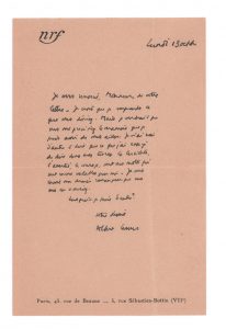 Signed autograph letter addressed to a stranger S.l., Monday October 13 [1947?], 1 page in-8 in brown ink on "NRF" letterhead. "Thank you, Sir, for your letter. I think I understand what you want. But I would like you to tell me how I can help you. I have nothing more to say than what I have tried to say in my books. Lucidity, friendship, courage, are words that are still valid for me. I'm sending you my latest novel to make sure of that. What else can I do? [...]».