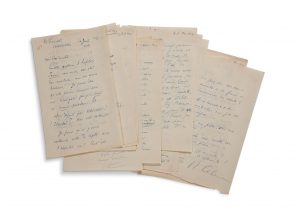 Set of 23 signed autograph letters addressed to his lawyer Thorvald MIKKELSEN S.l., June-December 1950, 36 pages in-4 in ballpoint pen, foliated letters in red pencil. Nice correspondence to his lawyer whom he requests: "Us again! With our food tickets. I hope I don't live as long as Pétain. The tickets either... The muses are asking me for their ammunition! Papers. Very courteous request to bring back the sex toad. Don't leave it lying around in Danish salons, dirty but hypocritical. We need Bibles for these Tartuffe and Andersen".