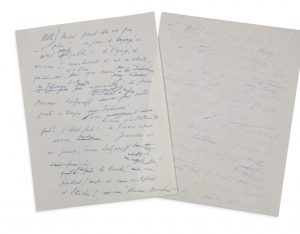 Nord, autograph manuscript, Circa 1957-1959. 1 page in-folio. Autograph manuscript of a passage of Nord with erasures and corrections and some unpublished variants from the final printed text. He speaks about his personal case: "Since the Voyage, it is illegible! Le Voyage, and more! Now he's so dumb, he looks so dumb, that even on television he can't be watched! Honestly! The proof, Mr. Lazareff has just blown up an hour of interview just in time! France is lost again! Juanovici is in prison but Lazareff, the eye to the breach! Yes! Everywhere! And without a school certificate! Honour! Profits!" (Romans, volume II, 2003, pp. 563-564).