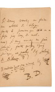 • Lettre autographe de Charles Baudelaire à Champfleury, signée «B. D.», s.l.n.d., 1 page in-8 à l'encre. «[...] Si vous voulez me faire un article de blague, faites le... mais si vous voulez me faire plaisir faites quelques lignes sérieuses, et parlez des Salons de Diderot [...]».