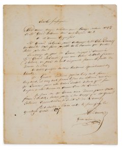 Autograph manuscript signed Paris, April 14, 1835. 1 page in-4 in brown ink on paper (freckles, stains, traces of folds). Handwritten contract between Alexandre Dumas and Gérard de Nerval. The text of the contract is in Dumas' hand, with his signature, and is also signed "Gérard Labrunie" in Nerval's hand. On April 14, 1835, Alexandre Dumas signed a contract with Gérard Labrunie and exchanged "one share of a thousand francs" paid by Nerval for several articles that Dumas promised him for La Revue de Paris. Dumas insisted on publishing his Impressions de voyage. The first two volumes appeared in 1834, the next three were published in 1837. For this, he needs money and signs this contract with Gérard Labrunie (not yet Nerval). Each article will be "at the price of one hundred and fifty francs for the sheet of the Revue de Paris. These articles, although at his choice, will deal especially with theatres". In 1834, Nerval inherits from his grandfather, and travels. He has the funds available to contribute to Dumas' company.