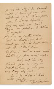Signed autograph letter addressed to Émile SCHUFFENECKER Pont-Aven, 1888. 3 pp. in-12 in ink on paper, envelope preserved, postmarked. Letter from Gauguin to his friend Émile Schuffenecker. Gauguin has just received his letter; he is happy to learn that he and his family are doing well. After dedicating the first page of his letter to Schuffenecker's occupations, he gives him some news: "The climate of Pont Aven is not quite what I need but what do you want we don't choose. In addition, there is such a mess at home that it takes time to get over it. For the last few days I have been getting a little better; the main problem is that I am less courageous at work. I see so black in the future, the struggle so compromised by the young gang! ...] The money issue is so important. From next month I will be obliged to ask Marie Jeanne for credit and at present I have 18 f in my pocket for petty expenses" and asks her if there is any hope that Madame Poujin will take "the painting of the negresses" from her.