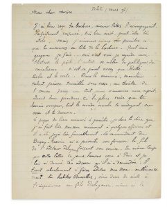 Signed autograph letter addressed to Charles MORICE Tahiti, March 1897. 2 pages in-4 in ink on ruled paper (horizontal and vertical folds). Letter from Paul Gauguin to Charles Morice, poet, essayist and one of the main theorists of symbolism, in which he thanks him for sending him his brochure and does not hesitate to give his opinion: "Perfectly reasoned, very well written, perhaps very useful, but I would rather see what you announce at the head of the brochure [...] I must tell you that I had a few officers read Noa Noa manuscript and it was judged very favorably. The commander of the Dugay-Trocin introduced me to his furrier, the son of the publisher Delagrave doing his service. [...] He absolutely wants Noa Noa to be published. ...I still hope to see noa noa printed before I die." He ends by talking about his health "coming back better, that is, the courage to live and work. I have just sent Daniel a few works that must be worthy of my old works from Tahiti, unfortunately this crude art from Papua (as Mauclair says) does not have much chance for the future. Finally my life is organized here to live from very little and finally I will have the rest".