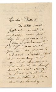 Signed autograph letter addressed to Camille PISSARRO S.l.n.d. [1882]. 2 pages ¼ in-12 in ink on a double sheet of ivory vellum (folds). "My dear Pissarro, Your orders will be faithfully carried out and your paintings will be taken to his house; I am going there tonight (to reach an agreement with him on this subject). I do not expect to see you until about the 21st of this month. The Renoir exhibition is a little less crowded than Claude Monet's; I saw yesterday at my brother-in-law's house a Norwegian art critic who thought that we should put a painting by Claude Monet in Luxembourg - I'm sending you a little something from Theodore de Banville is this movement we're talking about or a man in particular? Mr. Arosa was buried on Thursday and I received a letter to inform you that he was entrusted to my care (we did not know your address). I am not sending it to you, it is useless, but I am warning you so that you send your card, as I did not go there. You have had a series of good weather. I hope you were able to work in comfort. And your dinner went well, you don't tell me about it. Did the union form with the tenured ones and was the yellow Quid decreed dead? [...]». This letter from Gauguin to his friend the painter Camille Pissarro was written in 1882, the year of the seventh impressionist exhibition at the Durand-Ruel gallery in Paris. The two painters met in 1874 through the intermediary of the stockbroker Gustave Arosa, whose death is mentioned in this letter. The latter had been in 1867 the guardian of Paul Gauguin, who had become an orphan at the age of 19. He then helped him to become a stockbroker and introduced him to his future wife, the Danish Mette Gaad. At the end of his letter, Gauguin refers to a dinner of the Union of Painters that Pissarro, his eldest son and master who had participated in the 1848 revolution and was still animated by socialist if not anarchist ideals, had created in 1873. Gauguin respectfully ironically asked "if the death of the yellows has been decreed".