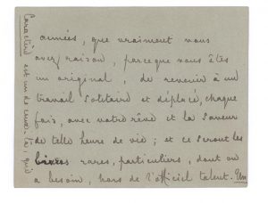 Signed autograph card addressed to the writer Léon HENNIQUE Paris, 21 May 1889. 2 pages in-16 in ink. "Thank you, Hennique; you have made a full-length portrait, which haunts, so human, against a background of mystery. I believe, and you know what I think of previous works where, alone, you completed the type of novel indicated by the art of these last years, that really you are right, because you are an original, to return to a solitary and inappropriate work, each time, with your dream and the savour of such hour of life; and it will be the rare, particular books which one needs, out of the official talent. A character is one of those, which remain on hand"...". Léon Hennique had just published his spiritualist novel Un caractère in the year 1889.