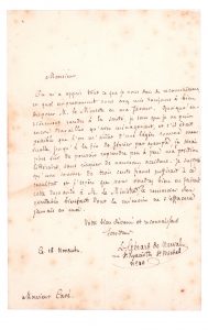 Signed autograph letter addressed to Auguste CAVÉ Paris, November 18 [1841]. 1 page in-8 in ink on paper (freckles, traces of folds). Signed autograph letter from Gérard de Nerval to Auguste Cavé, then Director of the Fine Arts Section at the Ministry of the Interior. He thanks him for his support: "I have been taught all that I owe you in gratitude and what eagerness you have always put Mr. Minister in my favour". A serious nervous breakdown in February 1841 forced Nerval to seek treatment from Doctor Blanche and to remain in his clinic from March to November of that year. He therefore found himself without money: "[...] Although I am fully recovered, I feel that I can still work only sparingly, and if it were possible to receive a small monthly sum of help, until the end of February for example, I would be more sure that I could gradually resume my literary position, without risking further accidents [...]". The crisis was so violent that he did not recover, partially and punctually, until the summer of 1842.