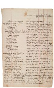 Autograph manuscript [circa 1877], 1 page ½ in ink on tinted paper, set. (Some freckles). List of 130 words in Spanish, with their translation in French. Arthur Rimbaud, wishing to go to Spain, makes up a mini-lexicon in Spanish with their translation in French, on two columns for the first page. Extremely rare document.