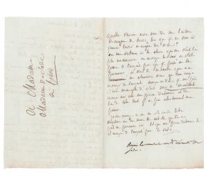 Autograph letter to his wife in Paris. S.l.n.d. 1 page in-12 in ink on azure paper, address on the back to Madame de Sade. Moving letter written to his wife from prison. "What reason do you have to let me lack everything, when I have never let you lack anything? The things I need most are being taken away from me here, or sent to me, or sent money for me to get them; I have just been assured that I will not be provided with anything that you have not sent money for, so please send some. If you're short of funds, here's a warrant. Also send me a piece of stomach and some cotton stockings that I absolutely cannot do without. I'm sending you a second list as well. Fill in at least the items I can't get here, such as my stomach piece &c and send money for the rest [...]". The second page contains a list of what Sade would like to receive from his wife.